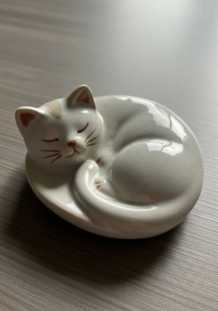 This sweet ceramic dish features a curled up cat resting peacefully, with its body forming a shallow bowl for holding small items. The soft ivory glaze gives it a warm, cozy look, while the gently crackled finish adds a touch of handmade texture. Tiny painted details like closed eyes, whiskers, and soft ear accents bring the little cat to life without overwhelming the design. The smooth curves and tucked tail create a natural shape that feels both decorative and practical.
