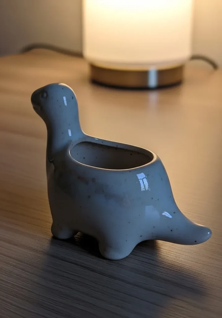 This adorable ceramic piece is shaped like a tiny dinosaur with a rounded body and a hollow opening along its back for holding small plants or trinkets. The soft grey glaze has a glossy finish with subtle speckles that give it a natural handmade feel. Its smooth curves and simple features keep the design clean, while the little legs and raised neck add just the right amount of personality. The opening is gently carved into the body, making it both functional and playful.