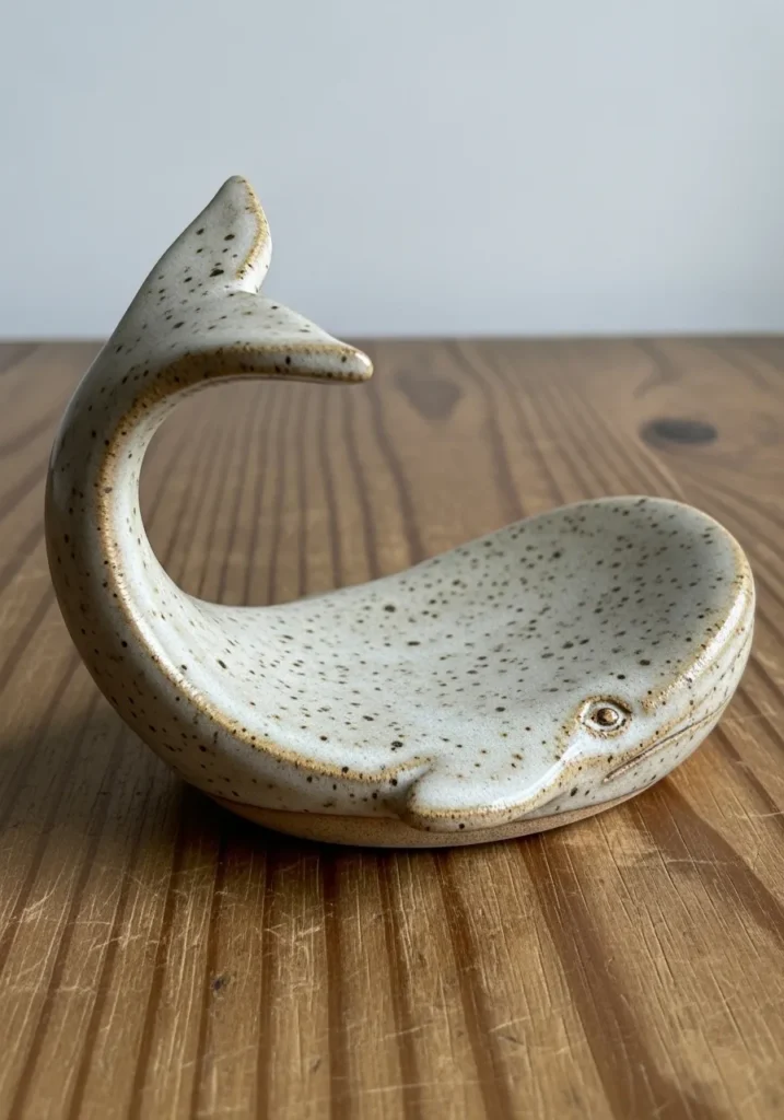 This charming ceramic piece is shaped like a gently curved whale, with its tail lifting upward to create a natural resting spot for utensils. The soft off white glaze is speckled with tiny earthy dots, giving it a warm, organic feel. The surface has a smooth yet slightly textured finish, with subtle glaze pooling along the edges that highlights its handmade character. A small carved eye and simple contours bring the whale to life without overcomplicating the design.