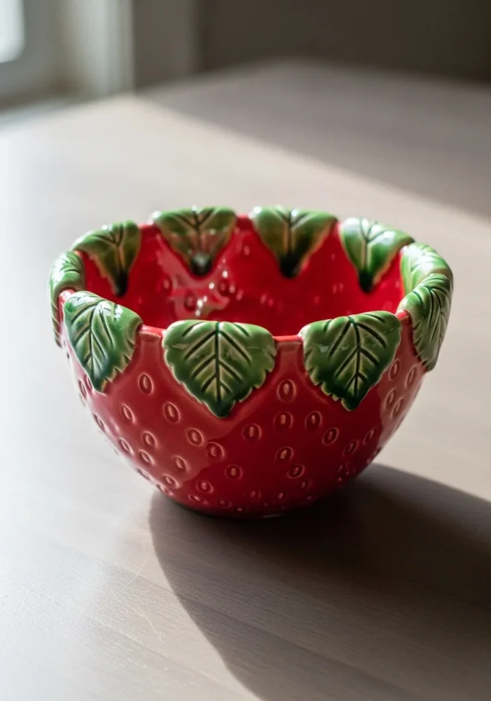 This vibrant ceramic bowl is designed to look like a ripe strawberry, with a rich glossy red glaze covering the outer surface and tiny indented seed details adding texture. Around the rim, raised green leaves wrap gently over the edge, each one carefully shaped with visible vein patterns. The inside of the bowl continues the glossy finish, creating a smooth and slightly reflective surface that contrasts beautifully with the textured exterior.