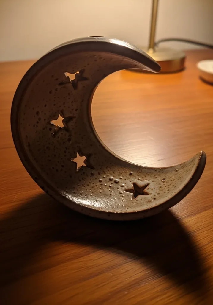This dreamy ceramic piece is shaped like a crescent moon, with softly curved edges and a hollow center that cradles a small tealight. Tiny star cutouts are scattered across the surface, allowing warm light to glow through and create a cozy pattern when lit. The glaze has a slightly speckled finish in earthy neutral tones, with subtle texture and small imperfections that give it a handmade feel. The smooth curves and gentle shine make it both calming and eye catching.