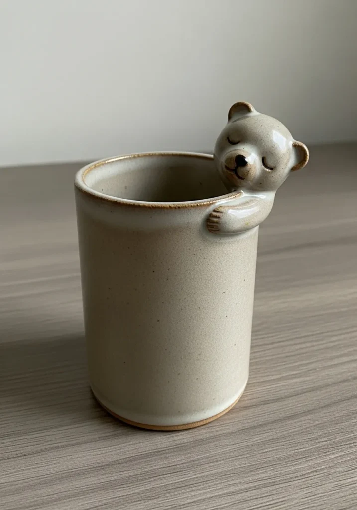 This charming ceramic mug has a soft cream body with a tiny bear peeking over the rim, its little paws holding on as if asking for a cuddle. The glaze is smooth and slightly matte, giving it a cozy, handmade look. The rounded form of the cup pairs perfectly with the small sculpted bear detail, making it both practical and heart melting.