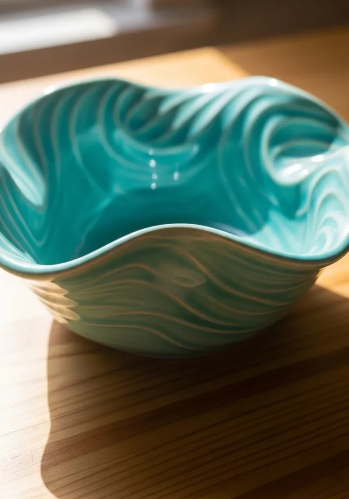 This flowing ceramic bowl features soft wave like edges and a dreamy turquoise glaze with lighter swirls running through it. The glossy surface enhances the movement in the design, almost like captured water. Its organic shape makes it feel artistic, while still being functional for snacks or display.