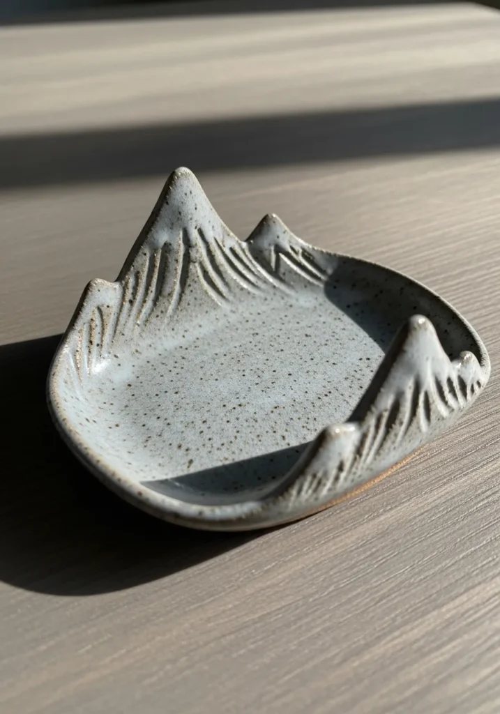 This minimalist ceramic dish is shaped like a tiny mountain range, with raised peaks along the back edge and a shallow tray in front. The soft gray glaze has subtle speckles that give it a natural stone like look. The matte texture keeps it grounded and earthy, perfect for catching incense ash or small jewelry pieces.