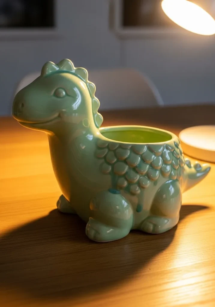 This sweet ceramic planter is shaped like a chubby little dinosaur with tiny legs, a curved tail, and textured scale details along its back. The soft mint green glaze gives it a playful, calming look, while the glossy finish makes it feel smooth and polished. The opening on its back is perfectly sized for a small succulent or trailing plant, turning this prehistoric cutie into a functional decor piece.