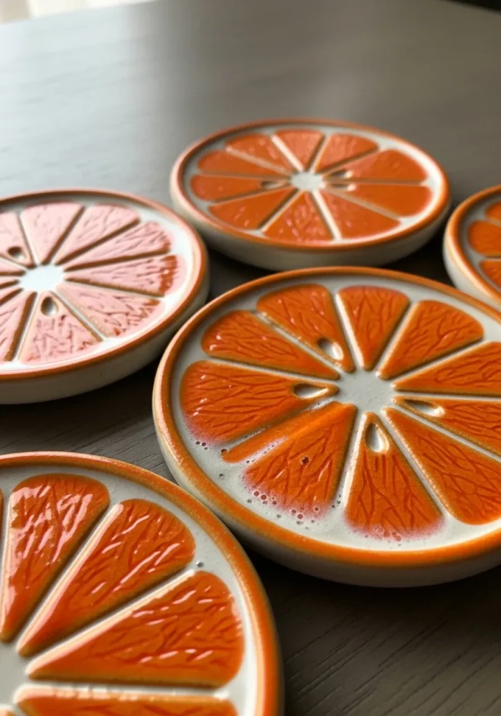 These vibrant ceramic coasters are designed to look like freshly sliced oranges and grapefruits, complete with carved segment lines and bright glossy glazes. The bold orange and pink tones pop against the clean white edges, and the slight texture from the carved details adds depth. Each piece has a smooth glazed surface that is easy to wipe clean, making them both decorative and practical.