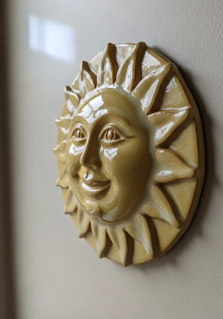 This ceramic wall plaque features a sculpted sun with a serene face framed by bold, textured rays. The warm golden glaze enhances the carved details, while the slightly glossy finish highlights the gentle expression. The raised design gives it dimension, making it a beautiful statement piece for a cozy wall.