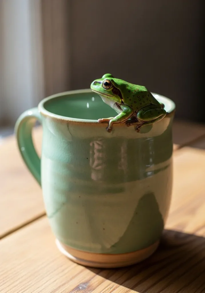 This charming ceramic mug has a soft green glaze with a slightly rustic finish, and a tiny frog perched right on the rim. The body of the mug is smooth and rounded, while the sculpted frog adds texture and character. The glossy glaze enhances the details of the little amphibian, making it look lively and fun.