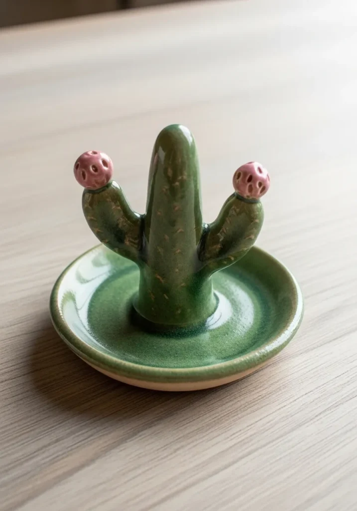 This adorable ceramic ring holder is shaped like a tiny green cactus with two small arms reaching upward, topped with delicate pink flower buds. It sits on a round dish base glazed in soft green tones that blend beautifully together. The glossy glaze gives it a vibrant shine, while the sculpted details add texture and personality.