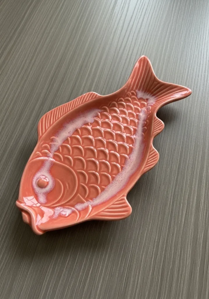 This coral toned ceramic dish is shaped like a fish with carefully carved scales and fin details. The glossy glaze brings out the texture, giving it dimension and character. Its shallow form makes it ideal for holding rings, keys, or other tiny treasures.