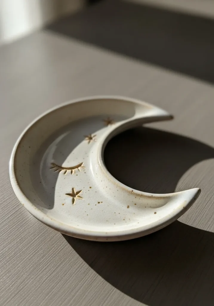 This elegant ceramic tray is shaped like a crescent moon with tiny gold star accents scattered across its surface. The soft off white glaze has a gentle sheen, and the curved edges create a graceful silhouette. Its shallow bowl design keeps jewelry secure while looking dreamy on a nightstand.