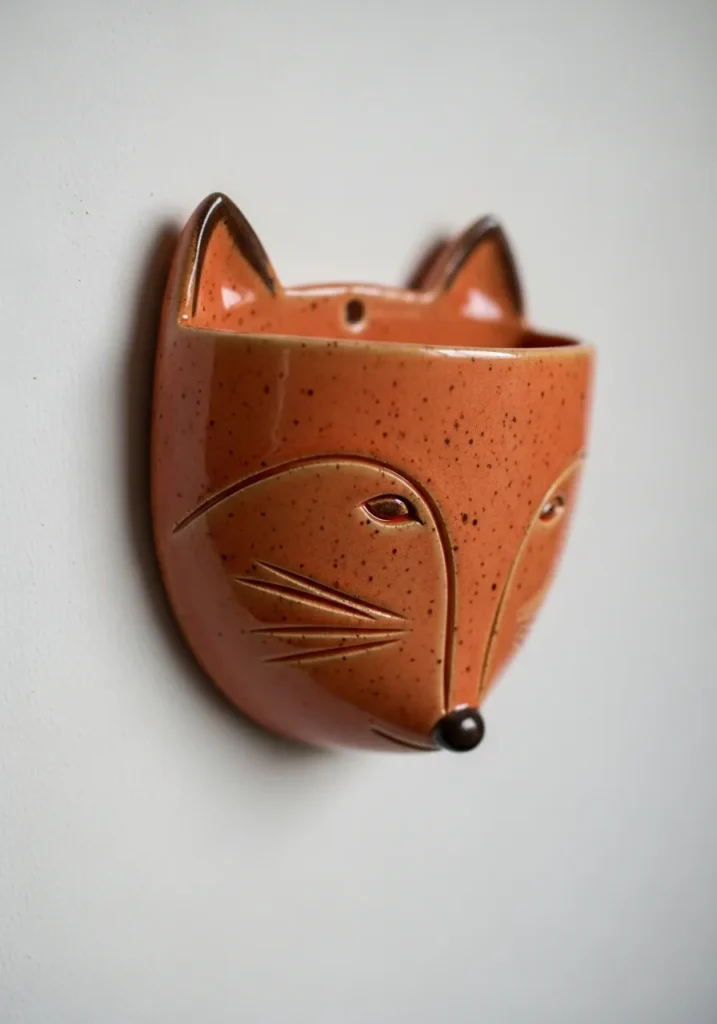 This adorable ceramic wall planter is shaped like a sweet little fox face with pointed ears and softly carved whisker details. The warm terracotta glaze has tiny speckles that give it a handmade charm, and the glossy finish adds a subtle shine. A small opening at the top allows for a trailing plant to peek out, almost like leafy hair. The smooth curves and simple facial lines make it feel modern but still cozy.