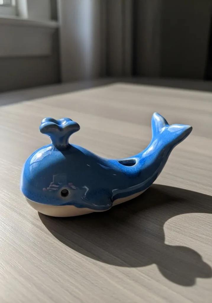 This glossy ceramic whale features a bright blue glaze that catches the light beautifully. The rounded body has a smooth surface, while tiny sculpted details like the eyes and tail fin bring it to life. Its compact size makes it perfect for a shelf or desk, and the cheerful color gives it a happy, ocean inspired vibe.