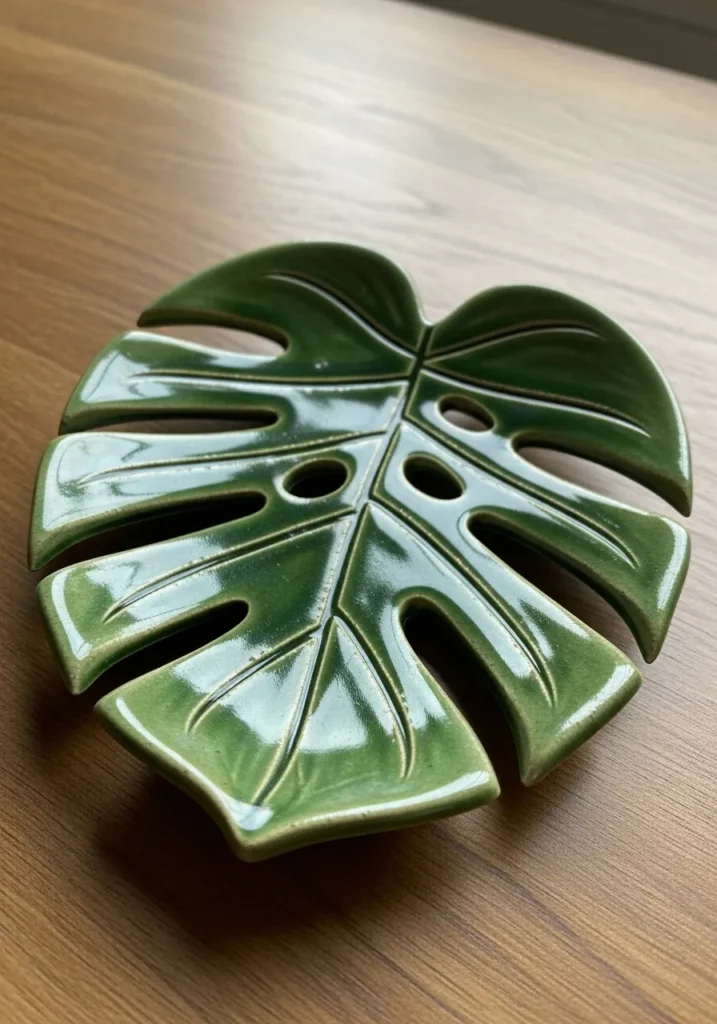 This ceramic trinket plate is shaped like a large monstera leaf with carved vein details that create beautiful texture. The deep green glaze pools in the grooves, highlighting every line and curve. Its glossy finish makes it feel fresh and vibrant, while the slightly raised edges keep small items neatly in place.