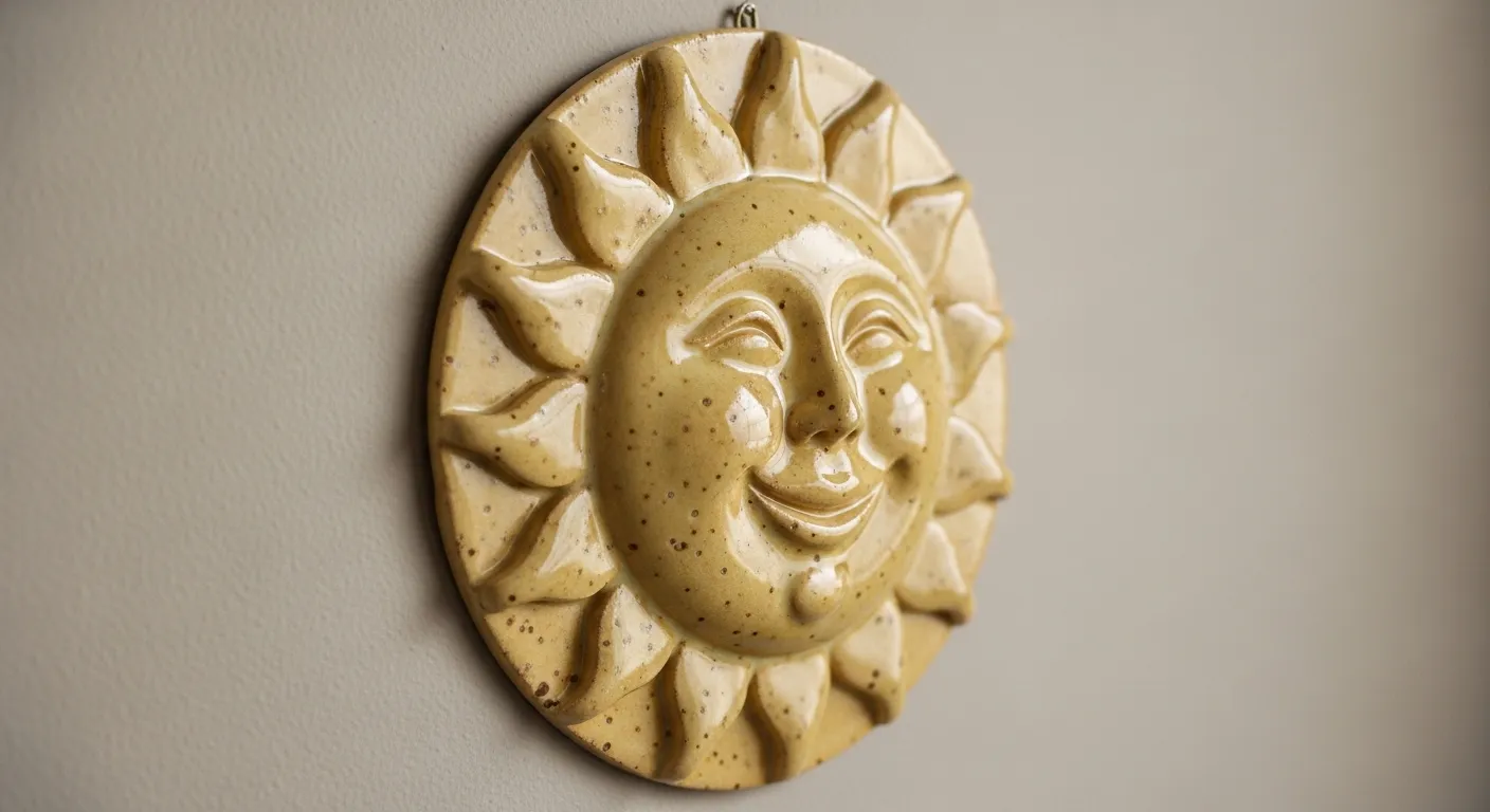 This ceramic wall plaque features a sculpted sun with a serene face framed by bold, textured rays. The warm golden glaze enhances the carved details, while the slightly glossy finish highlights the gentle expression. The raised design gives it dimension, making it a beautiful statement piece for a cozy wall.