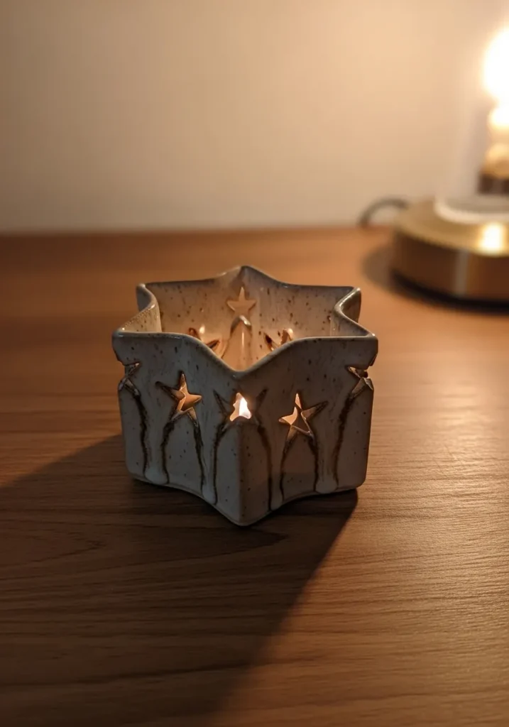 This cozy tea light holder is shaped with clean lines and small star cutouts that glow softly when lit. The neutral clay body keeps it simple, while the warm candlelight adds instant atmosphere. The slightly rustic edges give it a handmade and comforting look.