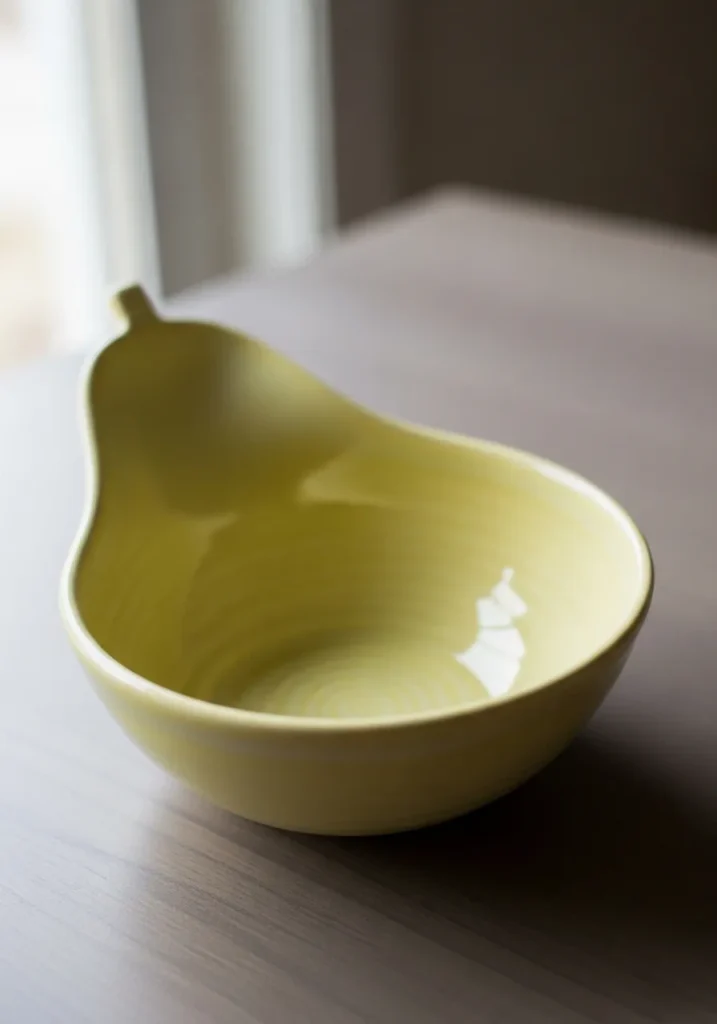 This pear shaped bowl features gentle curves and a glossy pale yellow glaze that feels cheerful but still calm. The organic shape adds personality, while the smooth interior keeps it functional. The subtle stem detail at the top finishes it off perfectly.