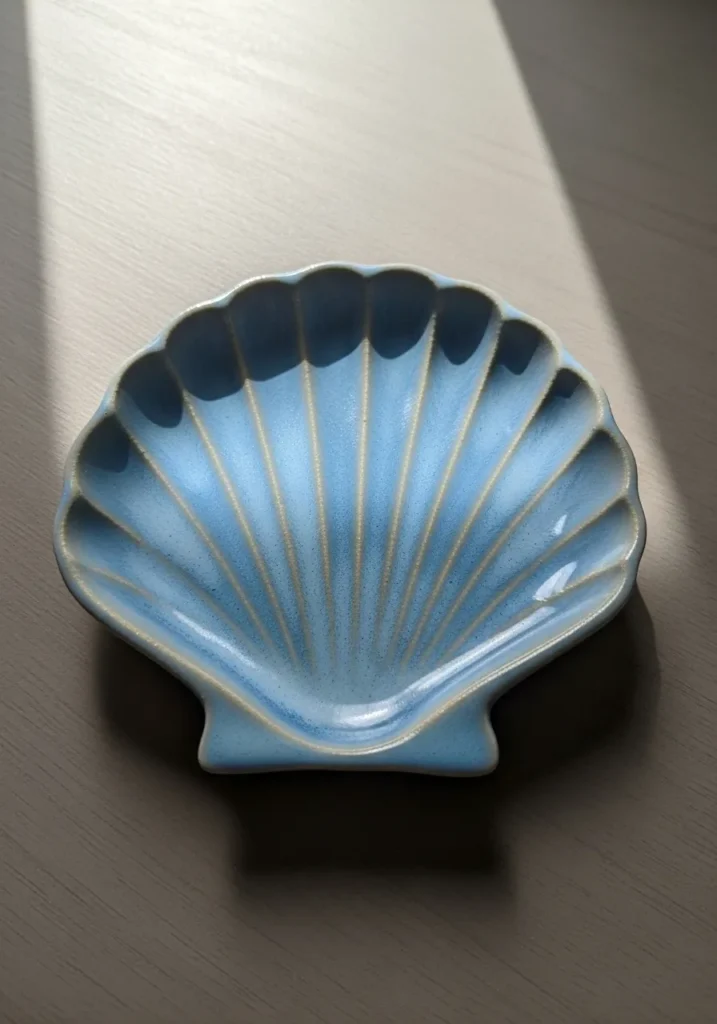 This shell dish has clean ridges and a glossy blue glaze that deepens along the grooves. The shape feels balanced and symmetrical, while the raised edges keep it practical for small items. It has a coastal softness that works in any space.