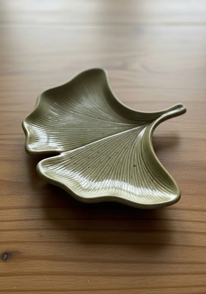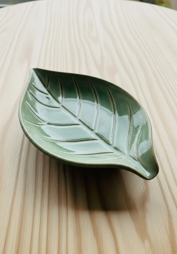 This leaf dish has flowing lines and fine vein details pressed into the clay. The muted green glaze settles into the texture, giving it depth and a natural look. The slightly curved edges make it both decorative and functional.
