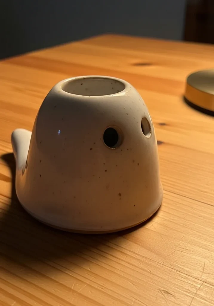 This tiny ghost sculpture is made from smooth light clay with simple round eye cutouts. The form is soft and rounded, giving it a cute and slightly whimsical look. Its matte finish keeps it subtle and charming.
