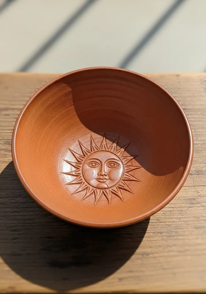 This warm terracotta bowl features a smooth interior with a hand carved sun design resting at the center. The clay has a natural earthy tone, while the etched lines add gentle texture without feeling busy. The shape is simple and rounded, making the sun detail the quiet focal point.