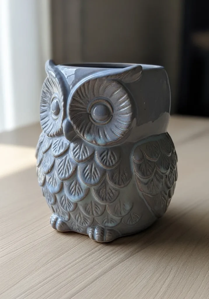 This small owl vase is sculpted with layered feather details and a soft gray glaze that settles beautifully into the texture. The rounded body feels sturdy, while the facial features give it a sweet and slightly whimsical look. The opening at the top works well for dried stems or small florals.