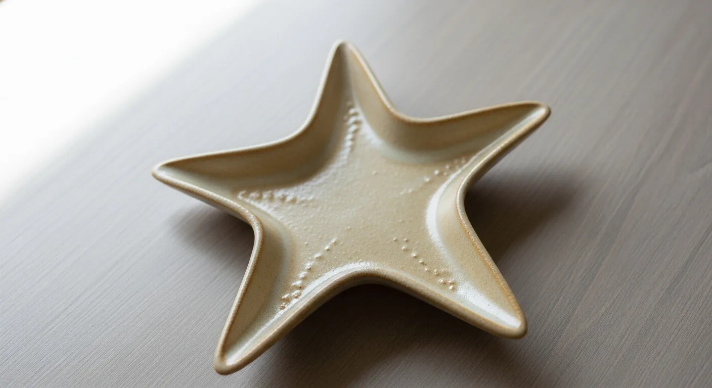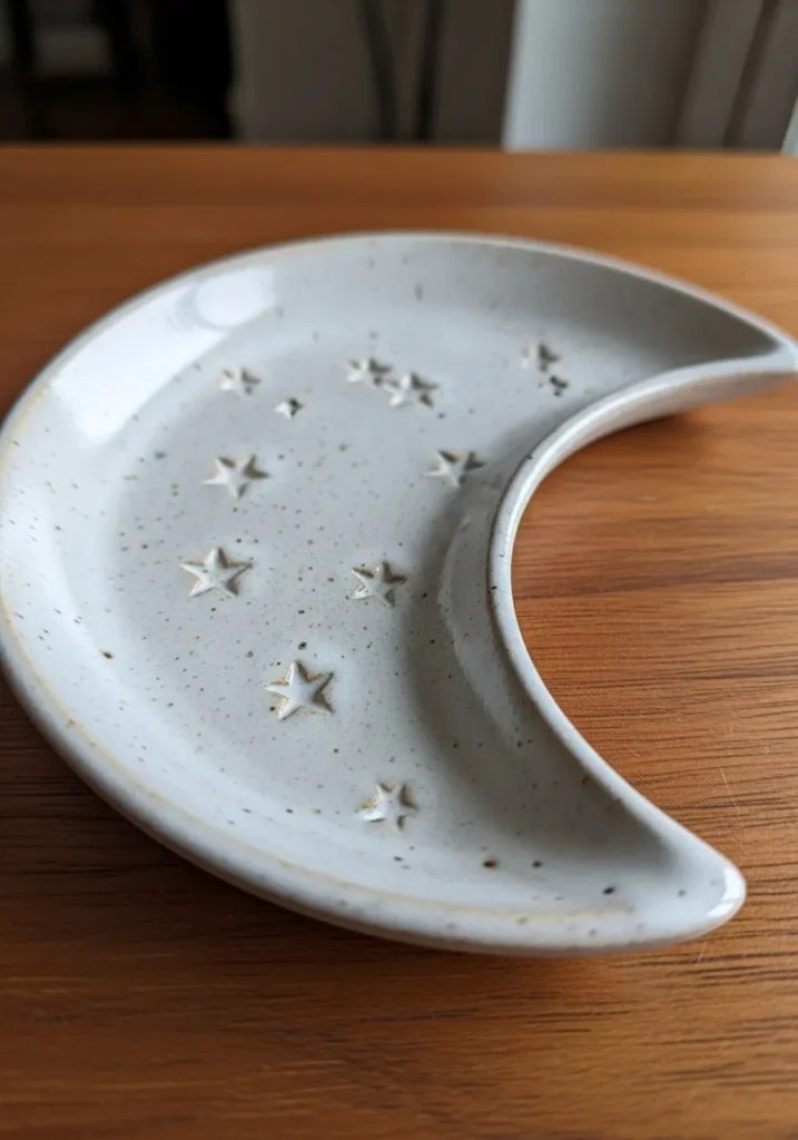 This moon shaped dish has a smooth matte finish with tiny star impressions scattered across the surface. The soft curve creates a shallow bowl that works perfectly for rings or small treasures. The neutral glaze keeps it calm and timeless.