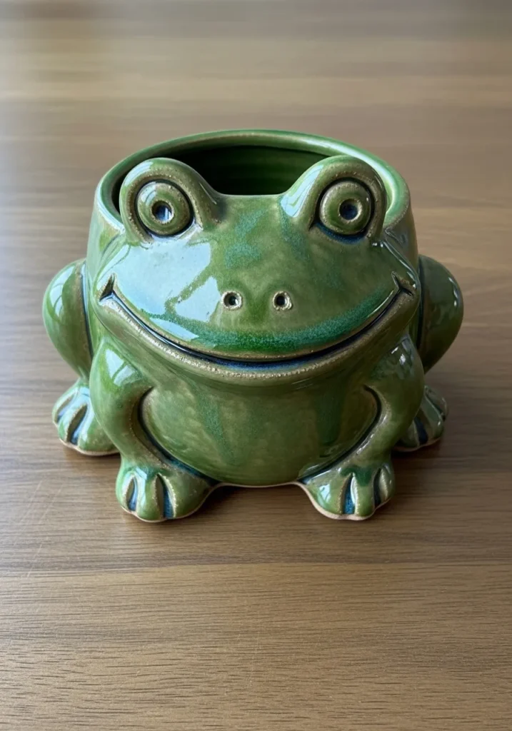 This cheerful frog planter has a glossy green glaze and a rounded open top for small plants. The sculpted eyes and smile give it loads of personality, while the smooth surface keeps it easy on the hands. It feels playful without being overdone.