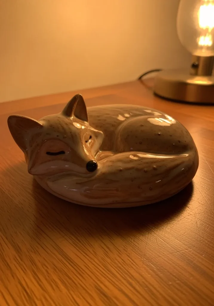 This sweet fox dish is shaped into a curled resting pose with soft sculpted details. The warm brown glaze has a gentle sheen that highlights the curves of the form. It feels decorative but still practical for small items.