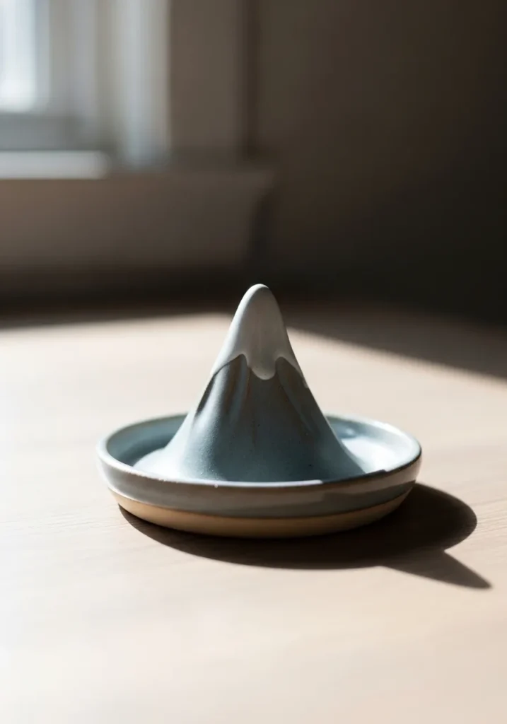 This small incense holder is shaped like a simple mountain peak with layered rings at the base. The cool toned glaze fades softly from dark to light, adding depth without distraction. The form is minimal and clean.