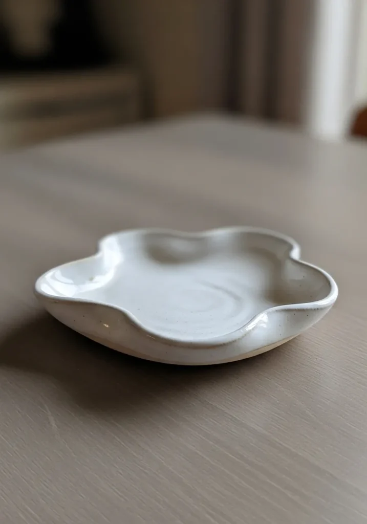 This little ring dish has an irregular wavy edge and a creamy white glaze that feels clean and modern. The shallow center makes it practical, while the uneven rim adds a handmade charm. The glaze breaks softly around the edges, showing just enough clay beneath.