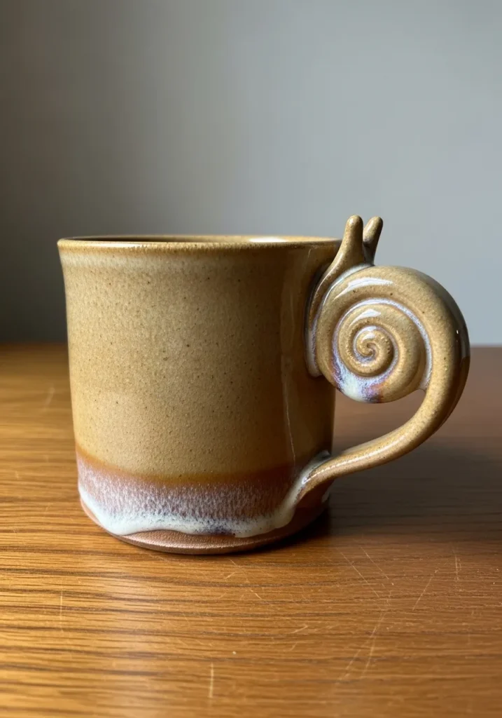 This cozy mug features a warm earthy glaze and a sculptural spiral handle that makes it feel special. The body has a soft matte finish, while the handle adds texture and visual interest. It looks comfortable to hold and inviting to use.