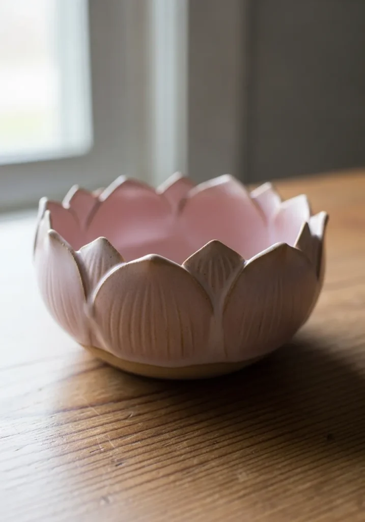 This bowl is shaped like an open flower with layered petal edges and a soft blush glaze inside. The outside remains neutral, letting the delicate pink interior stand out. The texture adds depth while still keeping the overall look light and airy.