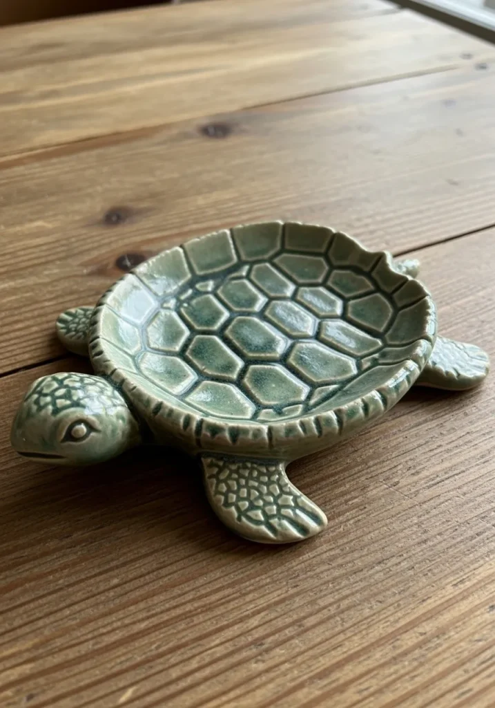 This adorable turtle dish is made from earthy stoneware with a soft green glaze that highlights the shell pattern beautifully. The textured shell adds depth and charm, while the small head and feet give it a playful sculptural feel. The shallow bowl in the center is smooth and practical, perfect for tiny items.