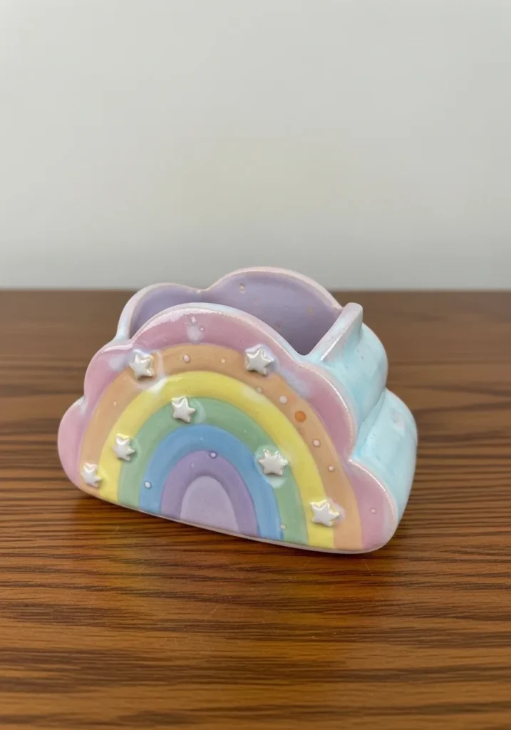 This clay napkin holder features a soft rainbow shape layered in gentle pastel tones. The surface is smooth with a slightly glossy finish that keeps the colors looking cheerful but calm. The rounded design feels sturdy while still looking playful on a table or shelf.
