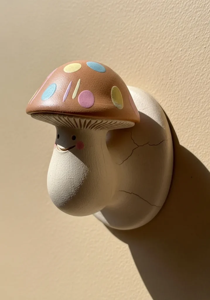 This clay wall hook is shaped like a whimsical mushroom with a soft neutral stem and a pastel dotted cap. The surface is smooth with gentle curves that keep it playful but minimal. It works as both wall decor and a functional hook.