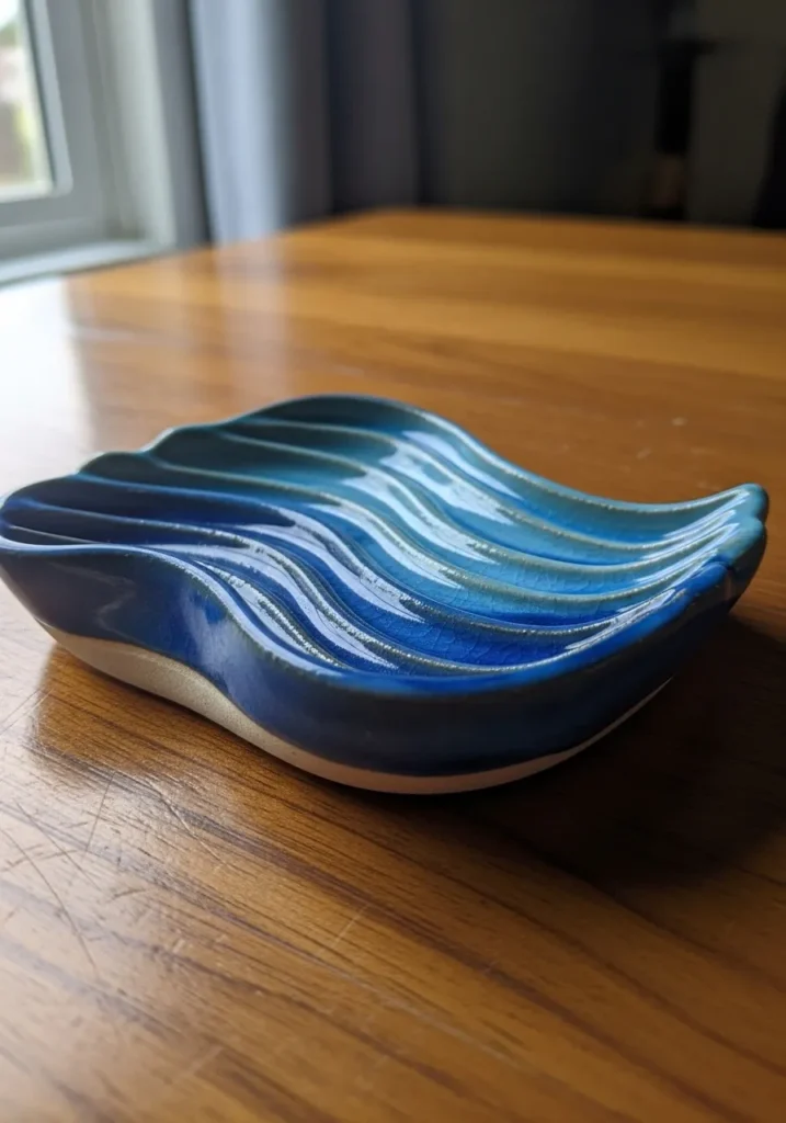 This clay bowl has a flowing wave inspired shape with layered curves and a glossy blue glaze. The glaze pools beautifully in the grooves, giving it depth and movement. The overall look feels calming and a little coastal.