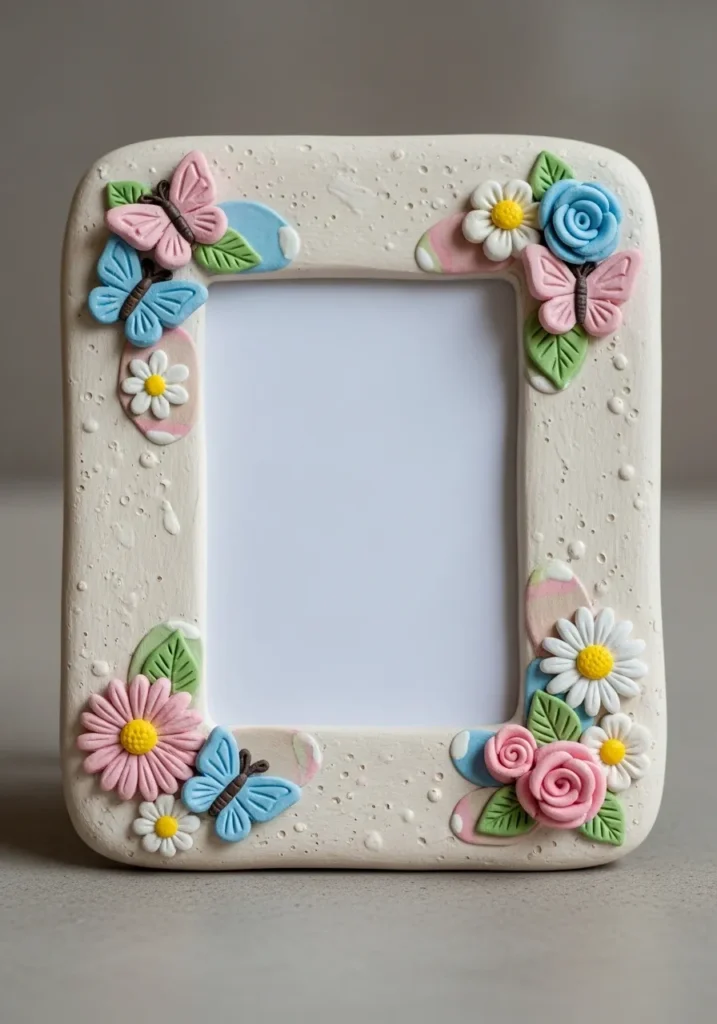 This clay photo frame features a simple rectangular base decorated with raised clay flowers and leaves around the edges. Soft pastel colors and tiny details give it a cheerful handmade look. The smooth background keeps the design balanced and not too busy.