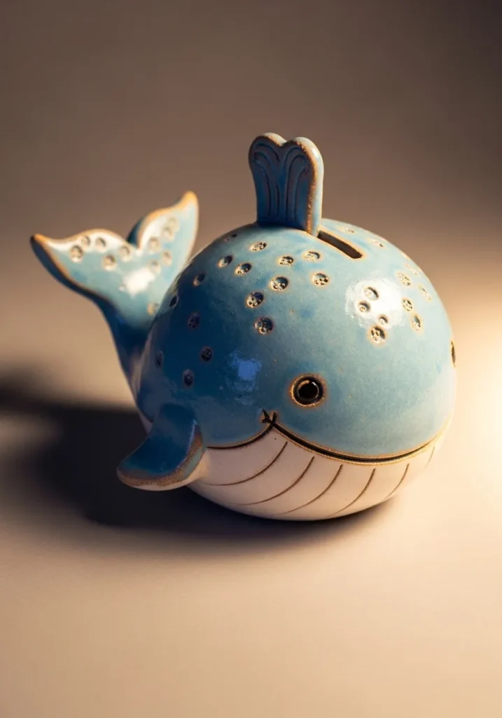 This clay figurine is shaped like a smiling whale with tiny dot details and a soft blue glaze. The rounded body and small fins keep it playful and friendly. The smooth finish gives it a polished but still handmade look.