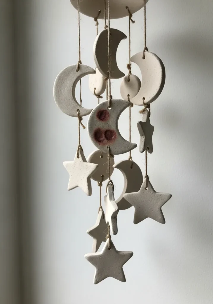 This clay hanging decor features crescent moons and star shapes linked together with simple string. The neutral tones keep it calm and aesthetic, while the cutout shapes add lightness and movement. It looks beautiful hanging near a window.