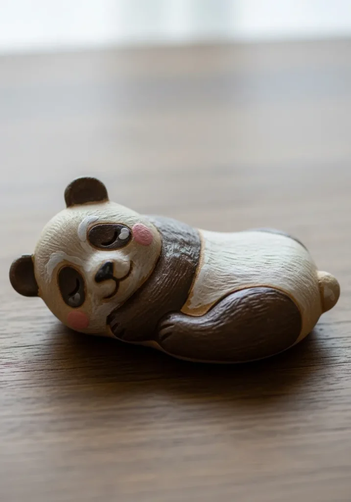 This clay figurine is shaped like a tiny sleepy bear curled up on its side with soft rounded features and gentle carved details. The neutral earthy tones keep it calm and cozy, while the smooth surface gives it a warm handmade feel. It looks perfect resting on a shelf or tucked into a small corner.