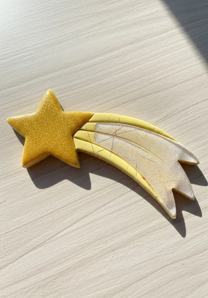 This clay piece features a bright star with flowing trailing shapes that feel light and playful. Soft neutral tones mixed with a pop of yellow keep it cheerful but still minimal. The smooth finish makes it feel clean and modern.