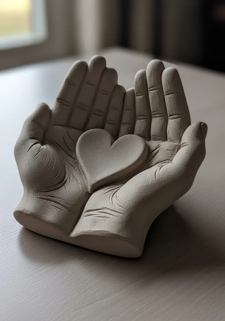 This clay sculpture shows two hands gently cupping a small heart at the center. The surface has soft texture lines that make it feel emotional and handmade. The neutral clay color keeps the focus on the shape and meaning.