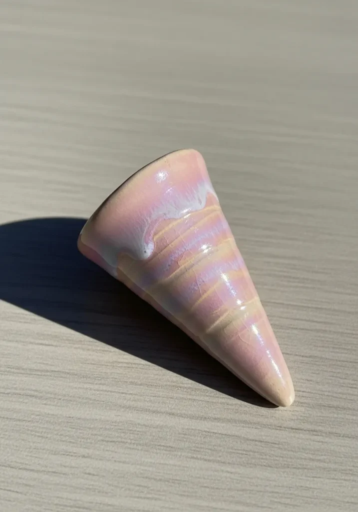 This clay ring holder is shaped like a simple cone with a soft pearly glaze that shifts slightly in the light. The smooth surface keeps it elegant while the shape stays practical. It sits neatly on a small base.