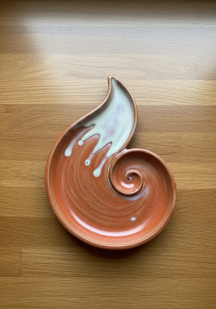 This clay trinket dish has a soft swirling shape that curves inward like a gentle wave. The glaze blends warm terracotta tones with lighter creamy highlights, giving it a cozy handmade feel. The smooth surface contrasts nicely with the flowing edges, making it both decorative and practical.