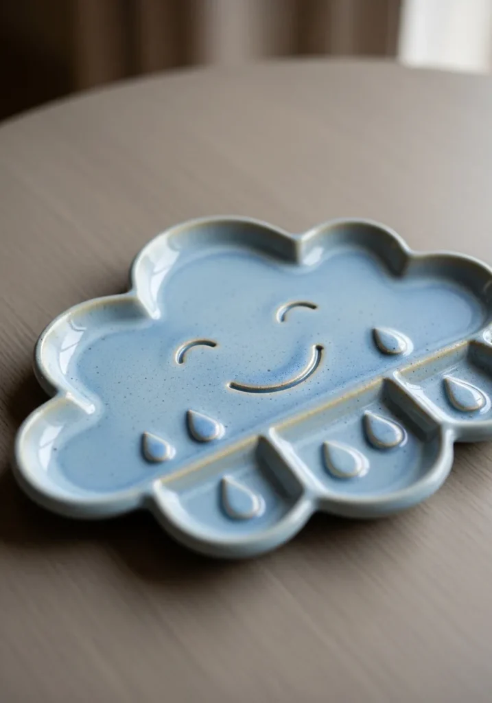 This soft blue ceramic dish is shaped like a fluffy cloud with a sweet smiling face carved into the surface. Tiny raindrop details add texture and personality, while the glossy glaze gives it a clean polished finish. The edges are gently rounded, making it perfect for holding rings and stud earrings without slipping. It feels playful yet neat on a dresser or vanity.