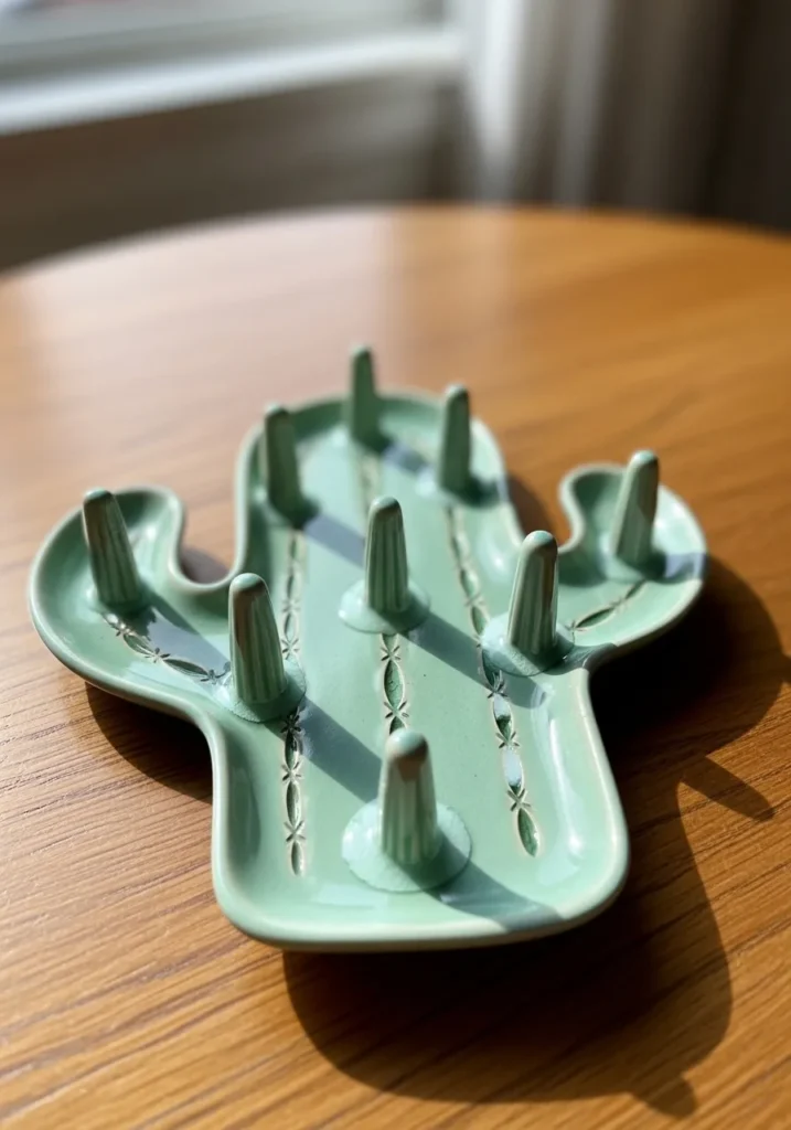 This pastel green jewelry plate is shaped like a cactus with multiple raised arms that act as ring holders. The glossy glaze enhances the smooth curves and playful silhouette. The base remains shallow and stable, making it easy to place on a dresser. It feels fresh and fun.
