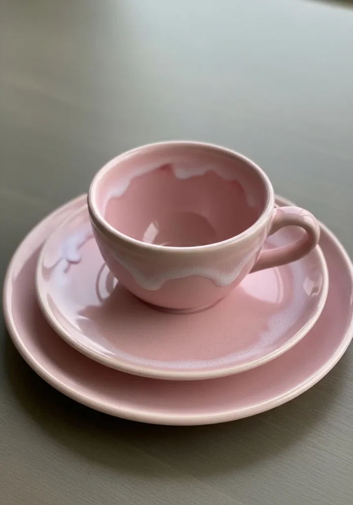 This sweet pink jewelry plate is designed like a tiny saucer paired with a mini cup shape in the center for holding rings. The glossy pastel glaze gives it a soft romantic feel. The layered silhouette adds dimension and makes it stand out on a vanity. It feels delicate and polished.