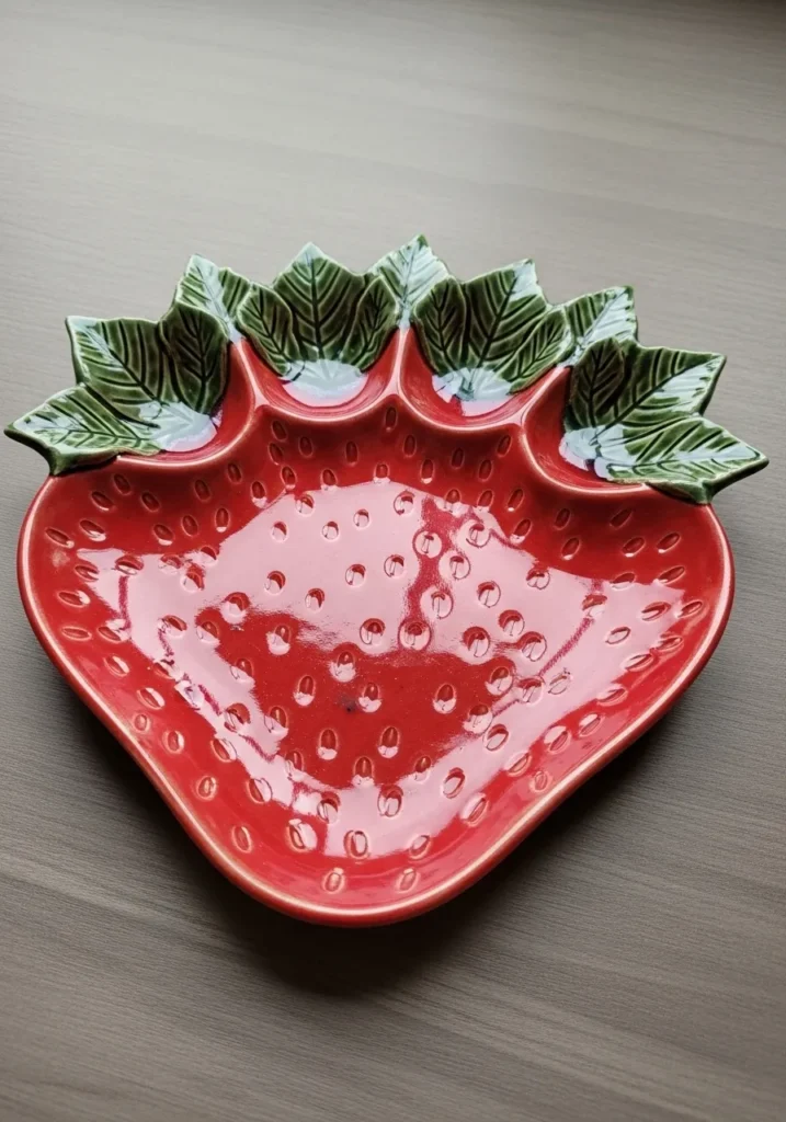 This bright red jewelry plate is designed like a ripe strawberry with raised seed details and leafy green accents along the top. The glossy glaze makes the color pop and adds dimension to every tiny indent. The shallow center is ideal for stacking delicate rings or small necklaces. It feels bold, fun, and totally eye catching.