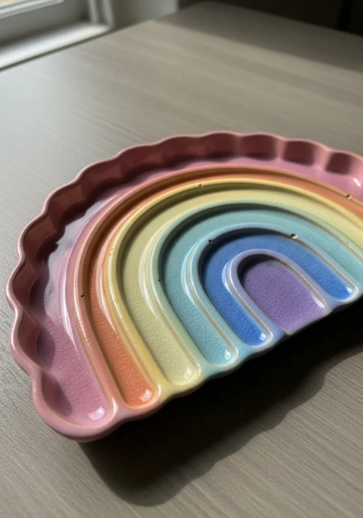 This vibrant plate features a sculpted rainbow arch with layered bands of red, orange, yellow, green, blue, and purple. The glossy glaze enhances each color and creates a cheerful shine. The curved edges form little sections that help separate earrings and rings. It feels joyful and bold.